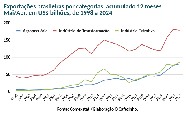 A participação relativa do agronegócio e da mineração, na economia, foi puxada para cima pelo avanço absolutamente sensacional desses dois setores. As exportações agropecuárias subiram 1.342% nesse período, e as da indústria extrativa, 2.329%! Mas as exportações da indústria de transformação também cresceram muito de 1998 a 2024.