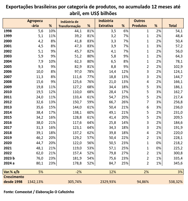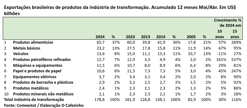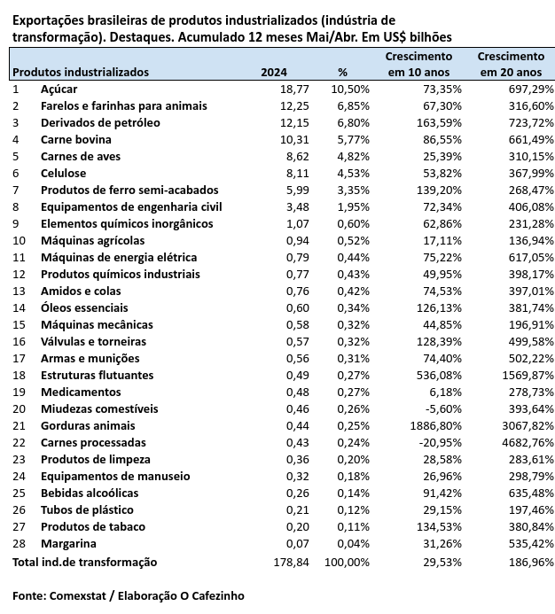 Nos últimos 12 meses (até abril), as exportações de produtos brasileiros industrializados totalizaram US$ 179 bilhões, ou que corresponderia, ao câmbio de hoje (que está R$ 5,15), a R$ 921,5 bilhões, um crescimento de 305% desde 1998!
