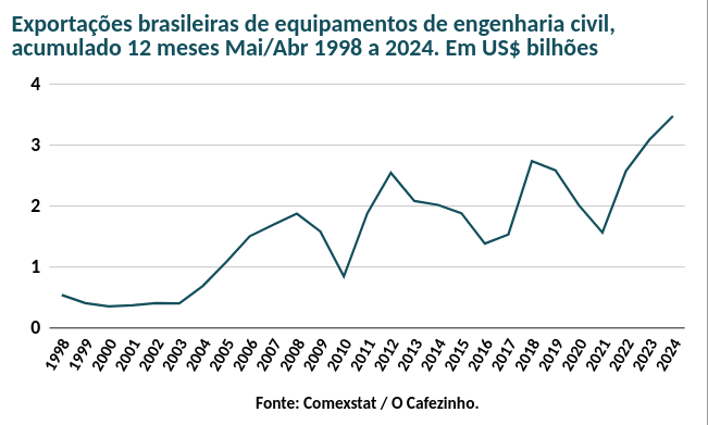 O item “equipamentos de engenharia civil”, para dar outro exemplo, registrou a exportação equivalente a US$ 3,48 bilhões nos últimos 12 meses, um crescimento de 406% em 20 anos!