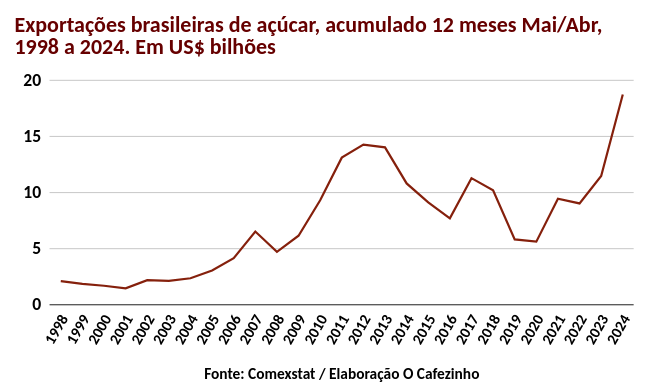Em primeiro lugar vem o açúcar refinado, cuja exportação gerou incríveis US$ 18,7 bilhões nos últimos 12 meses, um crescimento de 73% em 10 anos e de quase 700% em 20 anos!
