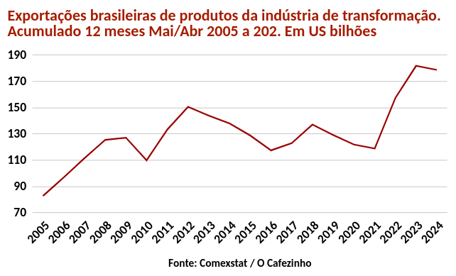 Nos últimos 12 meses (até abril), as exportações de produtos brasileiros industrializados totalizaram US$ 179 bilhões, ou que corresponderia, ao câmbio de hoje (que está R$ 5,15), a R$ 921,5 bilhões, um crescimento de 305% desde 1998!