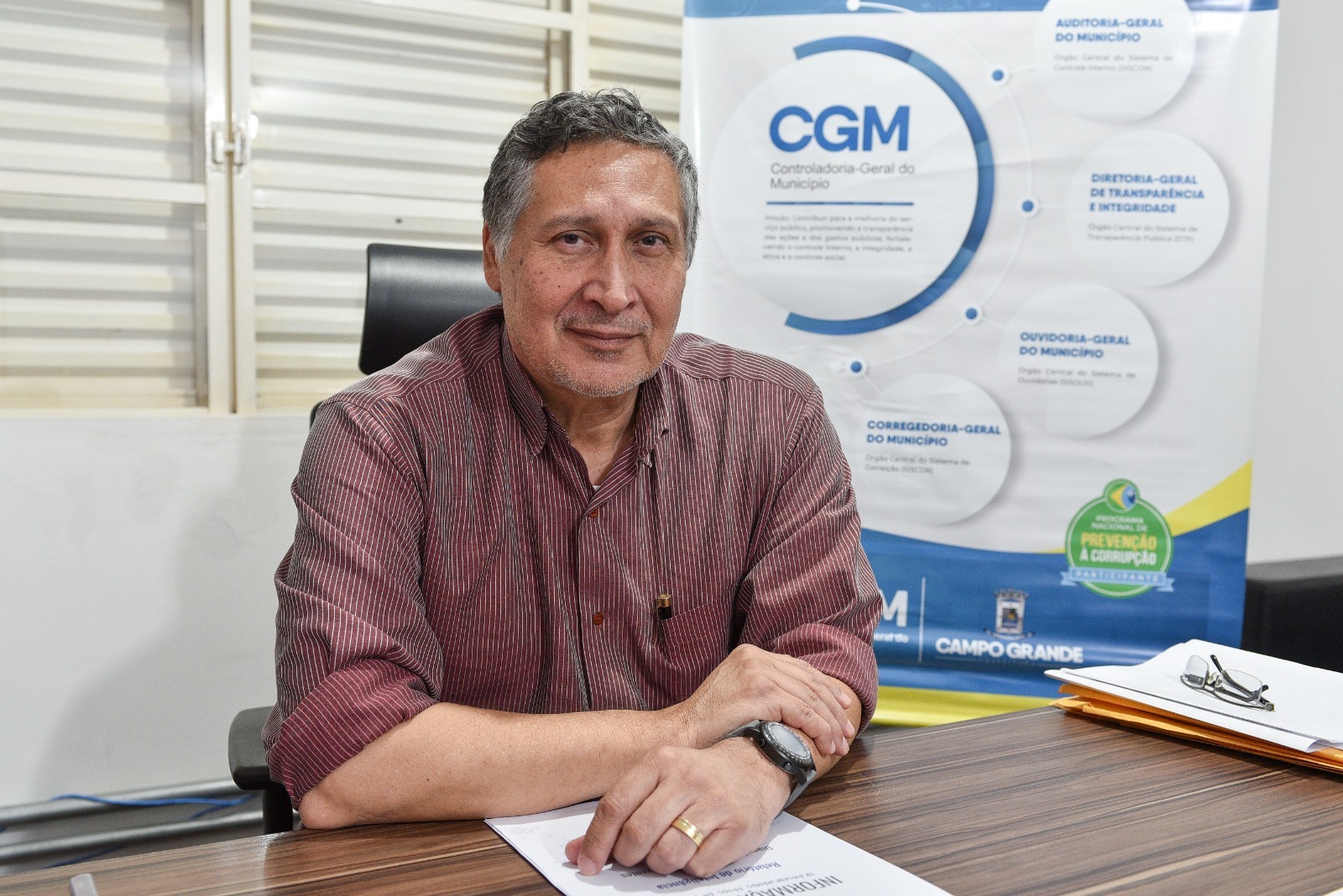 #pratodosverem A matéria possui duas imagens. A foto de capa é da fachada da Prefeitura de Campo Grande e a segunda foto é do controlador-geral João Batista, que está posicionado sentado e em sua mesa de trabalho em foto pousada de braços cruzados em cima da mesa e um painel da controladoria ao fundo.