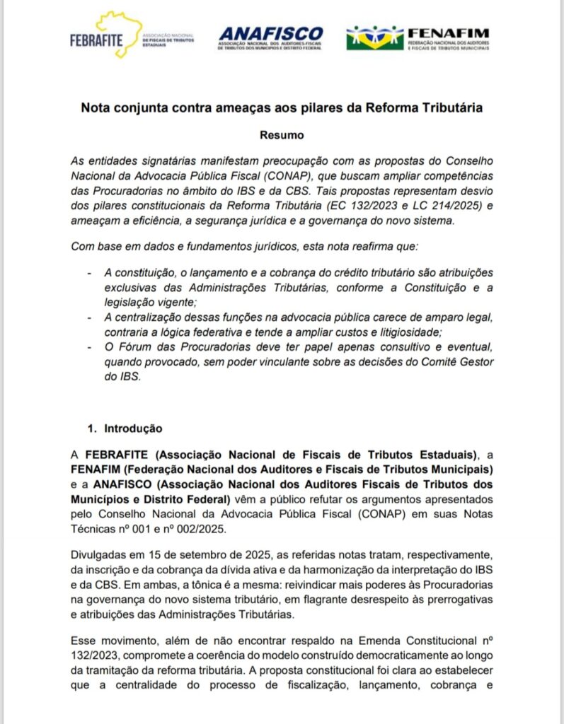 As entidades alertam que as propostas buscam ampliar indevidamente as competências das Procuradorias na gestão do IBS (Imposto sobre Bens e Serviços) e da CBS (Contribuição sobre Bens e Serviços). Segundo o documento, isso contraria a Constituição e ameaça os pilares da Reforma Tributária, ao deslocar funções que a Emenda Constitucional nº 132/2023 e a Lei Complementar nº 214/2025 atribuíram às Administrações Tributárias .