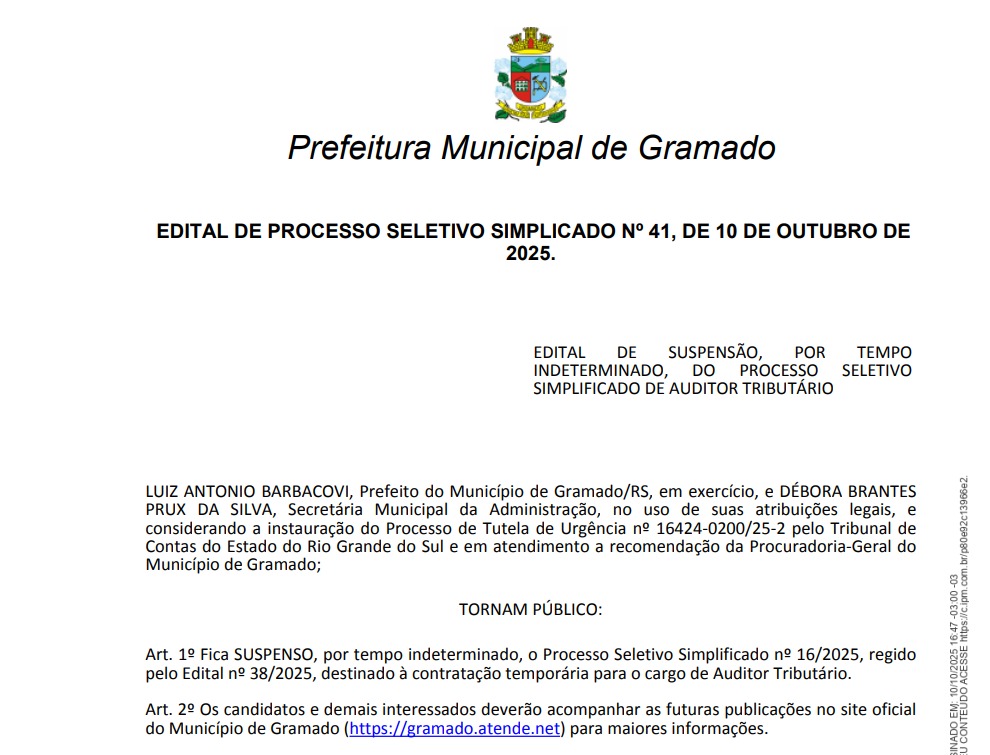 O Município de Gramado publicou, nesta sexta-feira (10), o Edital nº 41/2025, suspendendo por tempo indeterminado o Processo Seletivo Simplificado nº 16/2025, que previa a contratação temporária para o cargo de Auditor Tributário
