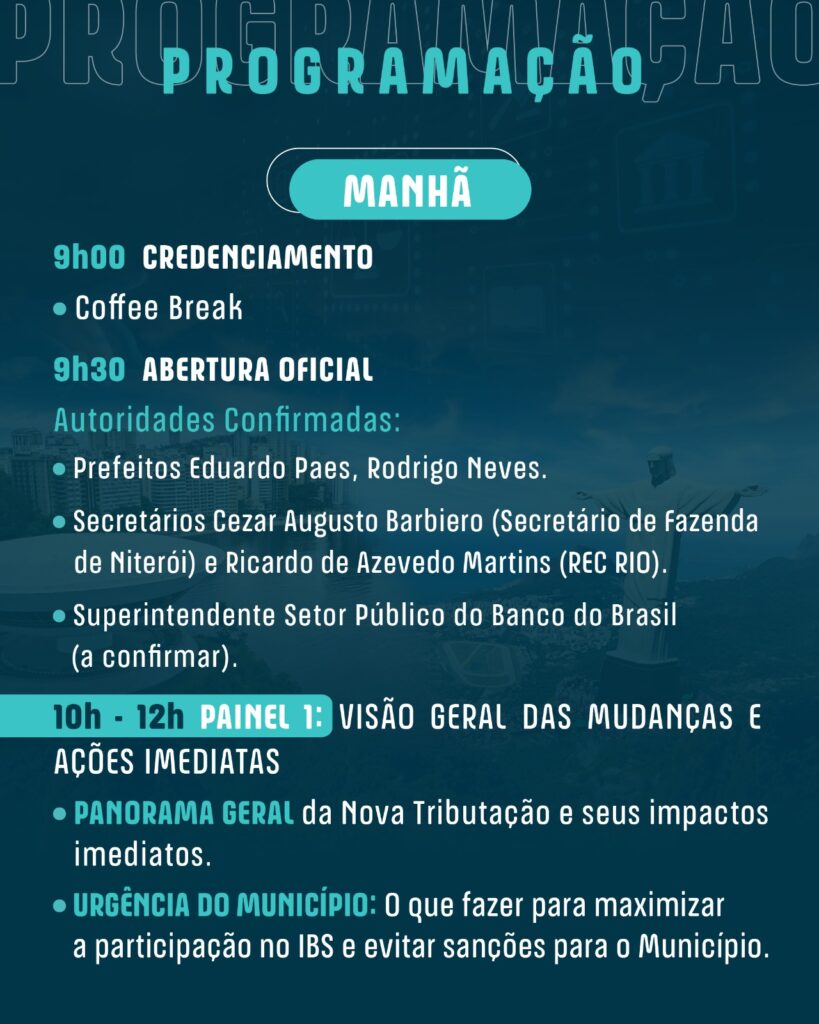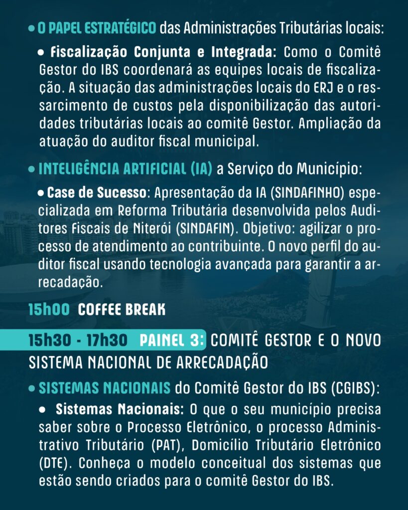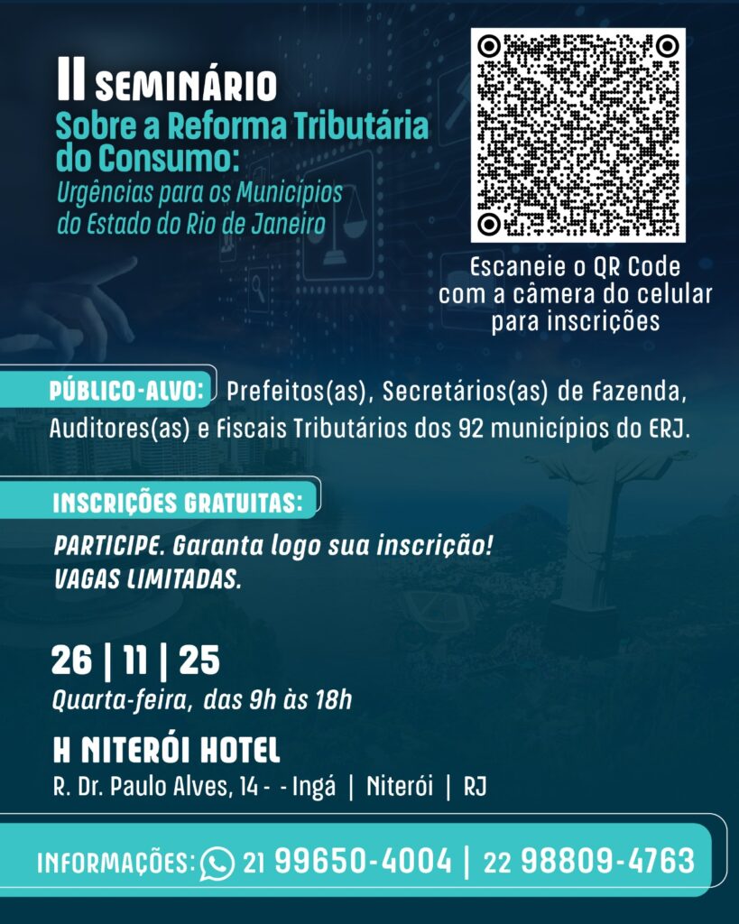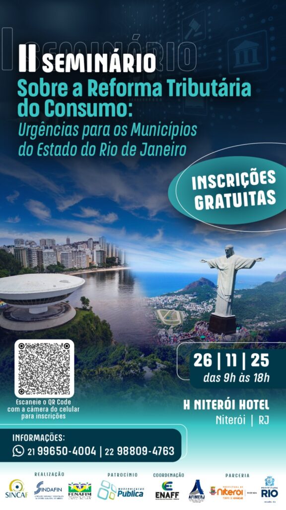 A Federação Nacional dos Auditores e Fiscais de Tributos Municipais (FENAFIM), Sincaf (Sindicato dos Auditores Fiscais da Receita Municipal do Rio de Janeiro), o Sindafin (Sindicato dos Auditores Fiscais de Niterói) e a Afimerj (Associação dos auditores e fiscais tributário do Estado do Rio de Janeiro), realizam no dia 26 de novembro de 2025, das 9h às 18h, o II Seminário sobre a Reforma Tributária do Consumo: Urgências para os Municípios do Estado do Rio de Janeiro. O evento acontece no H Niterói Hotel, em Niterói (RJ), com inscrições gratuitas voltadas a prefeitos, secretários de fazenda, auditores e fiscais tributários* dos 92 municípios fluminenses.