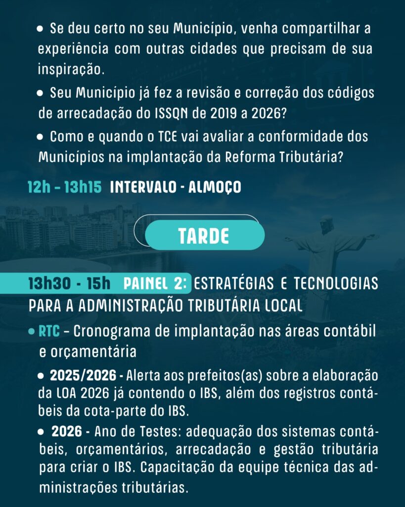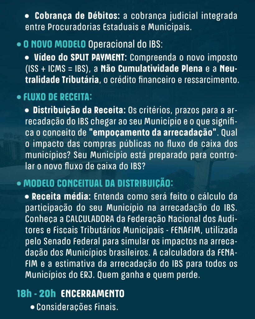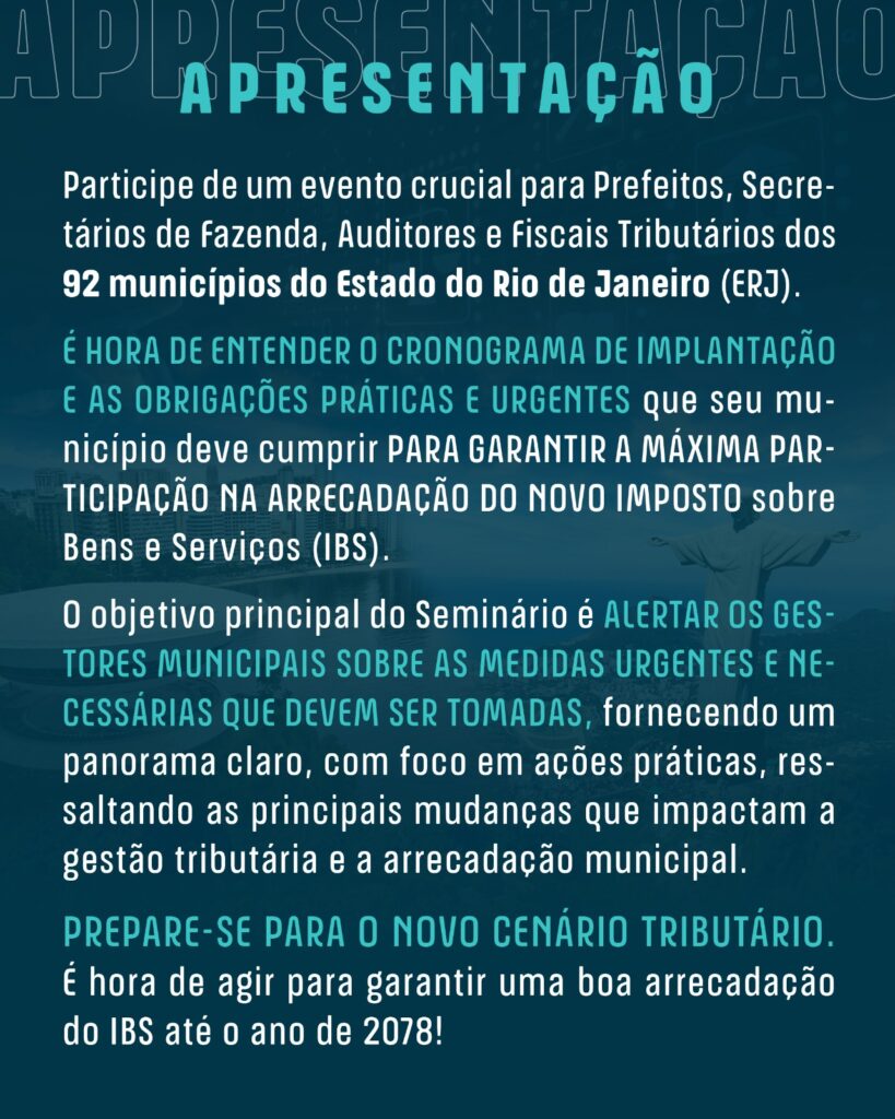 O seminário será um espaço estratégico de orientação e debate sobre as medidas práticas e urgentes que os municípios devem adotar para garantir a máxima participação na arrecadação do novo Imposto sobre Bens e Serviços (IBS). Com foco técnico e prático, o encontro abordará temas como o cronograma de implantação da reforma tributária, ajustes nas legislações municipais, **integração com sistemas nacionais, uso de inteligência artificial na fiscalização e estratégias para incremento de receitas locais.