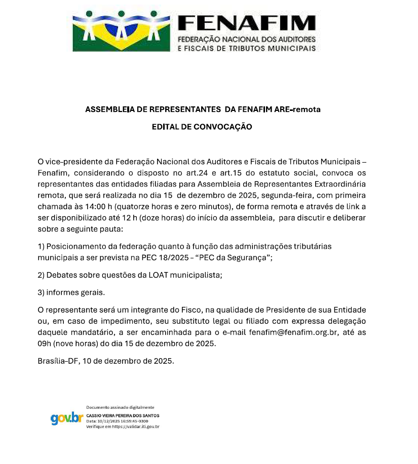 ASSEMBLEIA DE REPRESENTANTES DA FENAFIM ARE-remota EDITAL DE CONVOCAÇÃO Publicado em 10 de dezembro de 202510 de dezembro de 2025 por secretaria Versão PDF para impressão Click aqui: https://acrobat.adobe.com/id/urn:aaid:sc:VA6C2:082d01b1-80a2-453f-a945-d2665fda9519